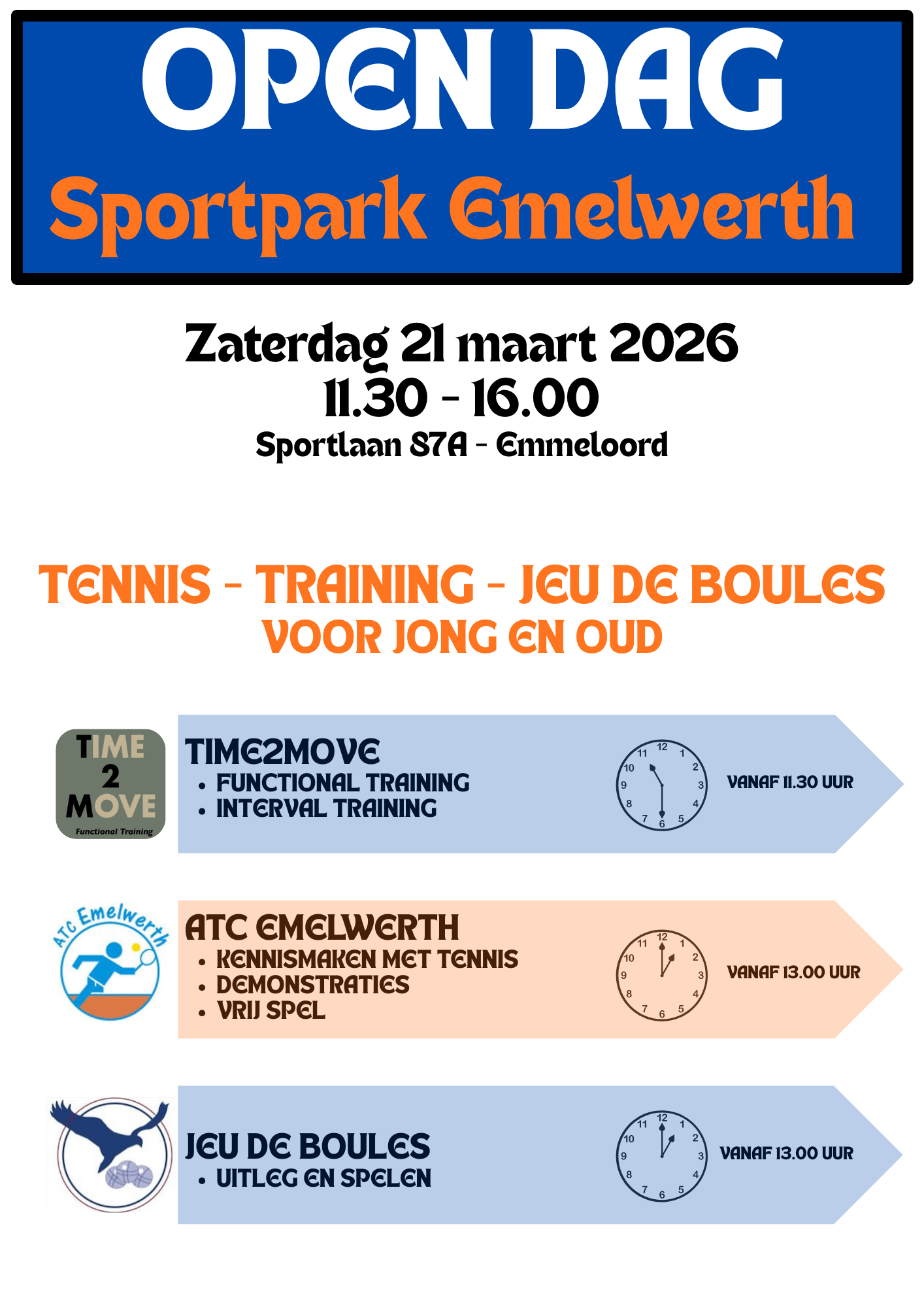 Aanstaande zaterdag organiseert A.T.C. Emelwerth in samenwerking met de Flying Boules en Time2Move een open dag op ons gezamelijke sportpark aan de Sportlaan.